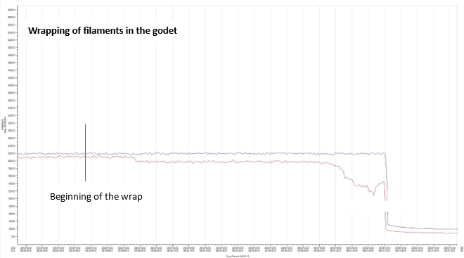 The Instrumar Fiber System identified data patterns that indicated filaments on one position starting to wrap around a godet. IFS promptly downgraded the package and issued a real-time alarm to notify the operator, indicating a potential godet wrap issue.