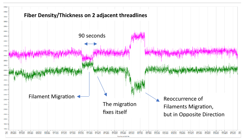 The Instrumar Fiber System (IFS) detected repeat occurrences of filaments migrating between adjacent threadlines which then fixed themselves after a short time. Instrumar data has shown this can even occur in both directions, where a given fiber bundle both gains and loses filaments beyond the initial filament count. IFS alarmed on the issue and the plant’s control software flagged the package for downgrade.